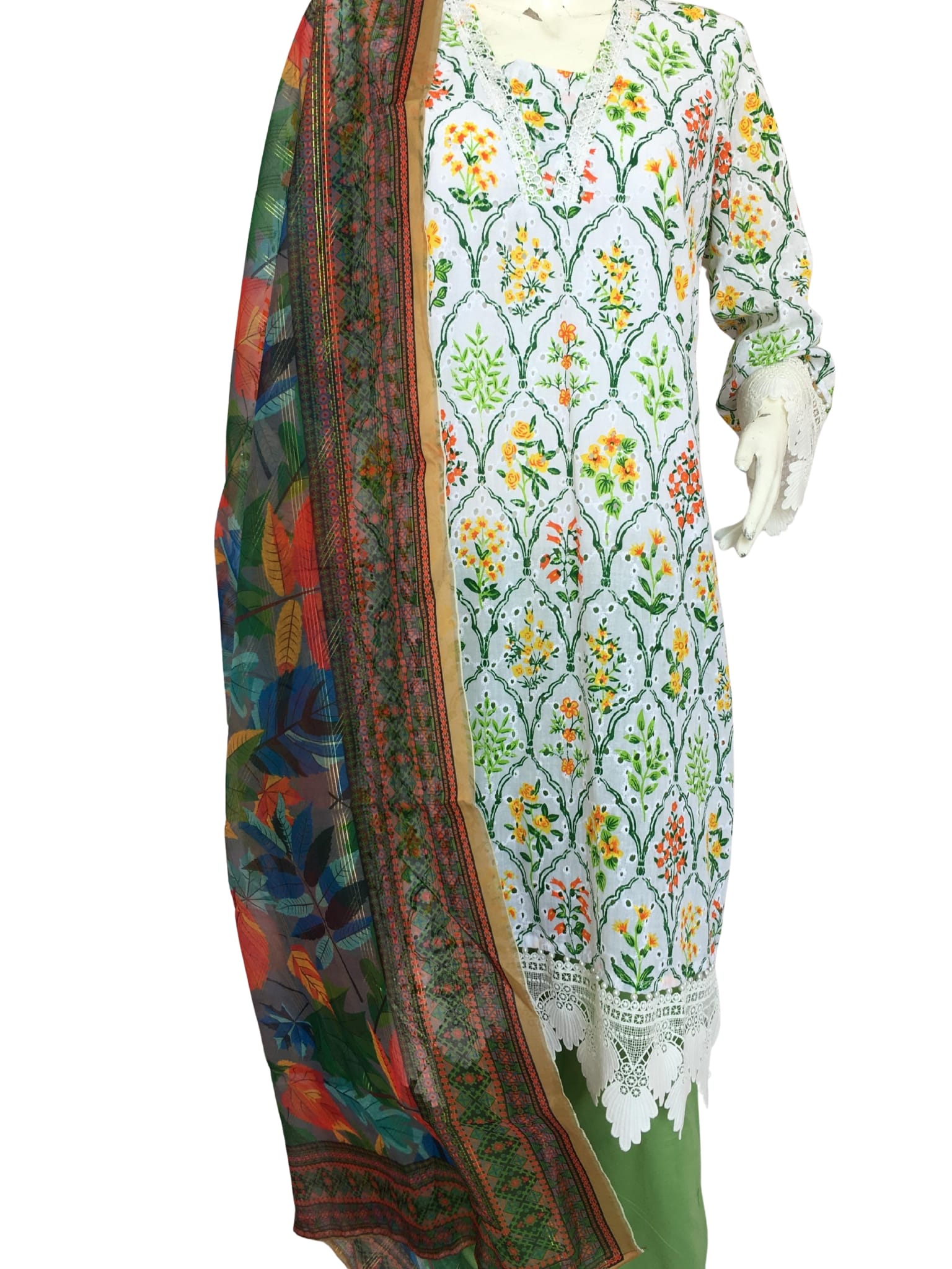 Multicoloured Flowers on White Chikarkaari 3pcs (lace embellished neckline)