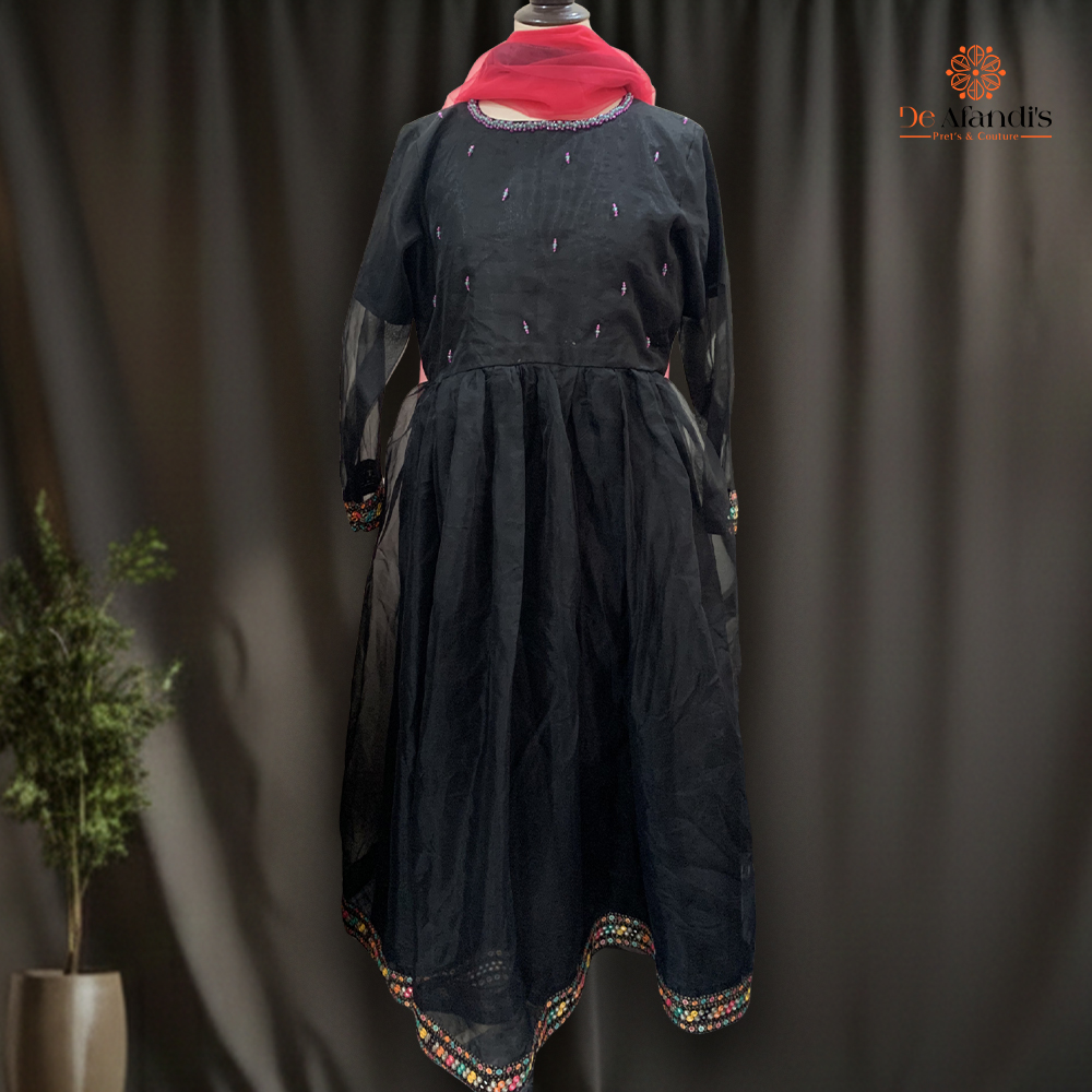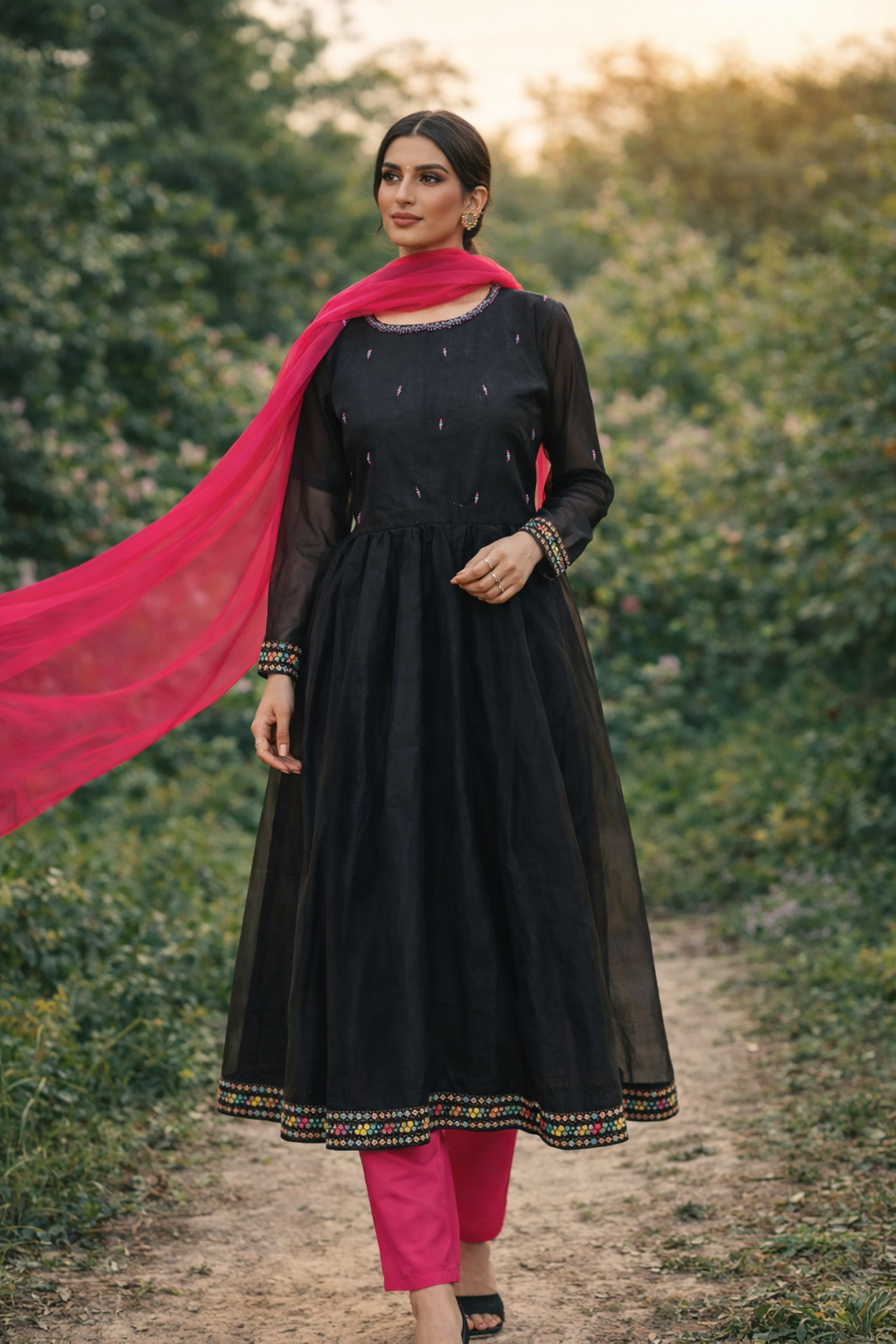 A sophisticated black frock set crafted from premium organza and katan silk, featuring intricate lace detailing on the borders and sleeves with delicate crystal embellishments on the neckline. Paired with straight pants and a contrasting pink net dupatta adorned with multicolor lace accents, this outfit is perfect for festive and formal occasions.