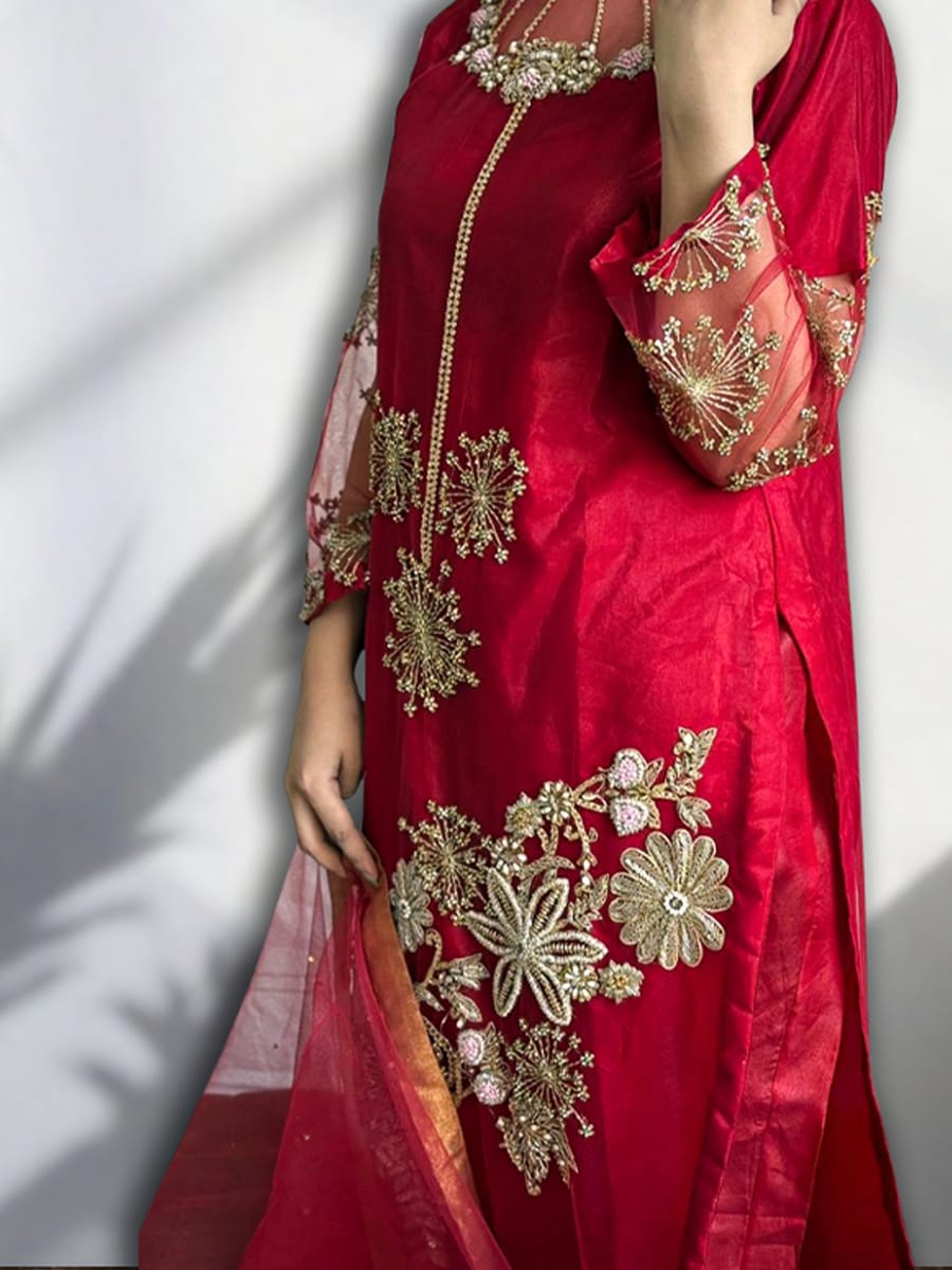 long shirt 3pcs Gold zari on Diamond Net