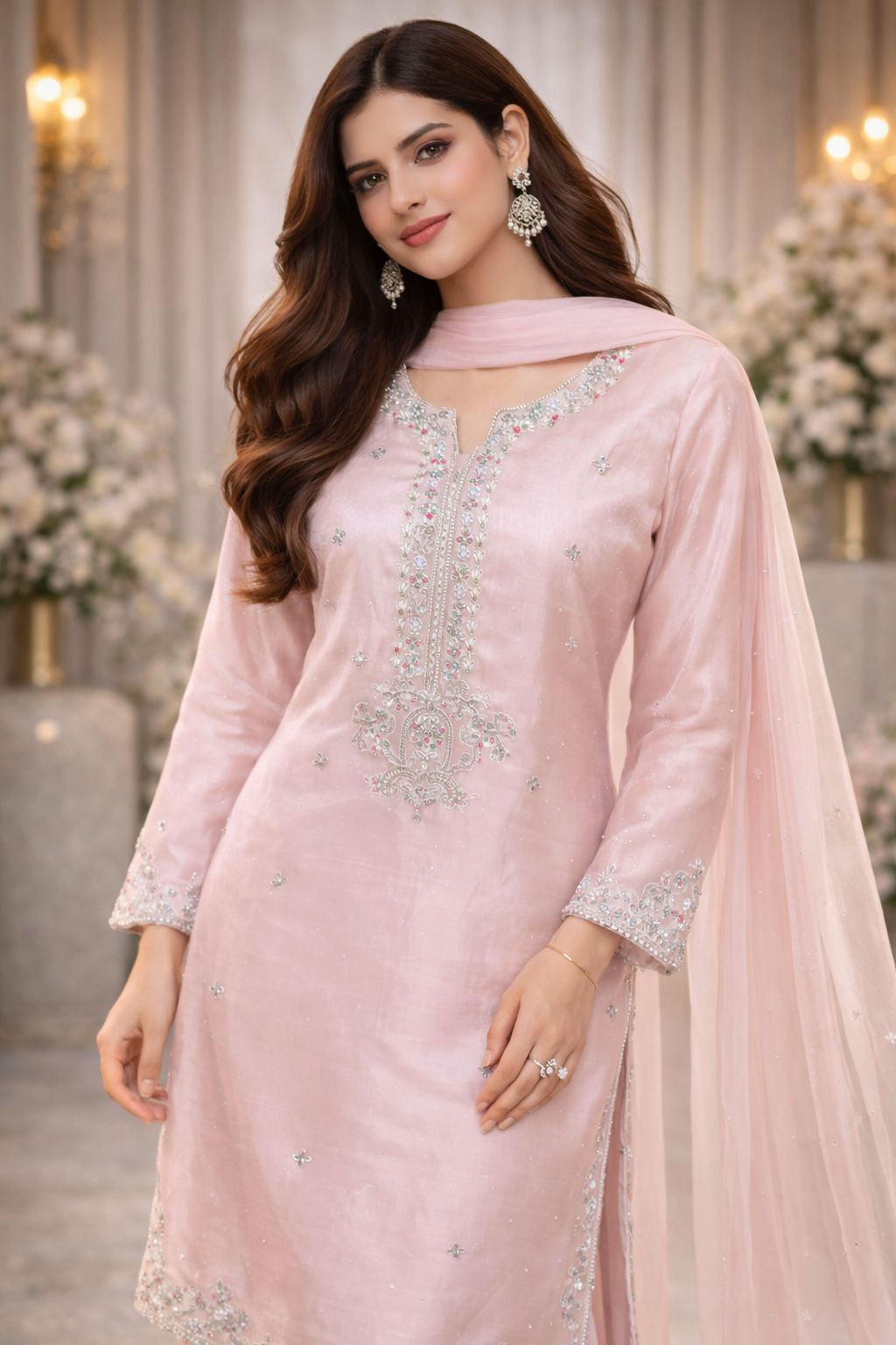 Prodcut Details: Heavily embroidered shisha silk , with shisha silk duppatta and kataan silk trouser.